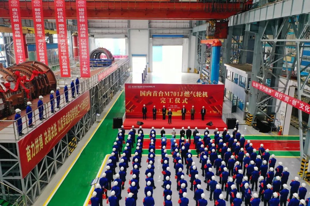 燃气轮机被誉为装备制造业“皇冠上的明珠”,是国家制造能力的重要体现。东方电气集团具备联合循环全套主设备供货能力,包括燃机、汽机、发电机、余热锅炉等,以“自主研发”和“国际合作”双线并进策略,助力中国能源高质量发展。自主燃机方面,2020年11月27日,在6位院士和50多名专家的共同见证下,国内首台F级50兆瓦重型燃气轮机实现满负荷稳定运行,标志着东方电气集团已经完整地掌握了燃气轮机自主设计、制造、试验全过程能力。2022年,“G50”列入国家首台(套)重大技术装备(项目)名单,并在东方电气全负荷试验台上完成了72小时长时连续稳定运行,具备商业化条件。“G50”燃机还先后获得国家能源局批复的两个示范电站项目,实现了我国自主燃机产业的跨越式发展。国际合作方面,2022年10月15日,国内首台M701J燃气轮机顺利完工,此次完工的M701J燃气轮机,燃机透平入口温度超过1600℃,联合循环效率超过64%,NOx排放浓度低于50毫克/标准立方米,按年运行4000小时计,较同容量燃煤电厂一年可以减少160万吨的二氧化碳排放,是世界上性能领先的燃气轮机产品,标志着东方电气集团成为国内首家掌握世界最先进H/J级燃气轮机制造技术的能源装备制造企业,为我国全面掌握世界领先的燃气轮机制造技术奠定了坚实基础。