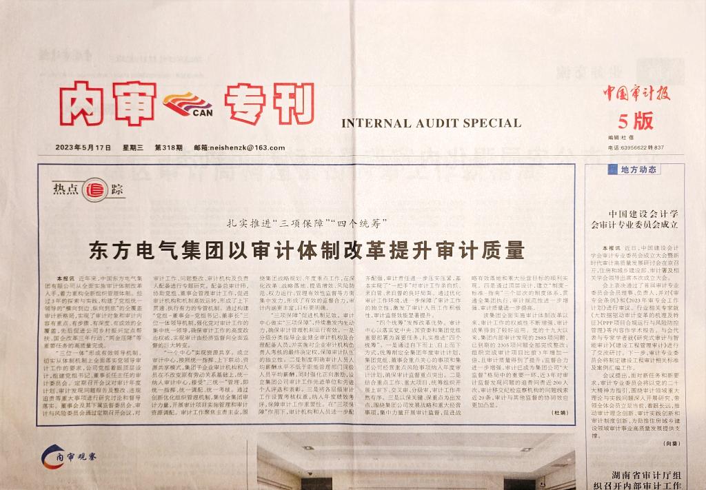 本报讯 近年来,中国东方电气集团有限公司从全面实施审计体制改革入手,着力重构全新组织管理体制。经过3年的探索与实践,构建了党组统一领导的“横向到边、纵向到底”的全覆盖审计新格局,实现了审计对象和审计内容有重点、有步骤、有深度、有成效的全覆盖,先后促进公司乡村振兴定点帮扶、国企改革三年行动、“两金压降”等重要任务的高质量完成。
