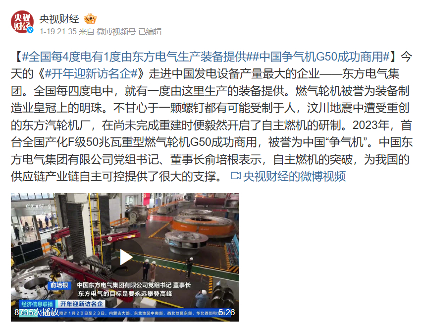 【#全国每4度电有1度由东方电气生产装备提供##中国争气机G50成功商用#】今天的《#开年迎新访名企#》走进中国发电设备产量最大的企业——东方电气集团。全国每四度电中,就有一度由这里生产的装备提供。燃气轮机被誉为装备制造业皇冠上的明珠。不甘心于一颗螺钉都有可能受制于人,汶川地震中遭受重创的东方汽轮机厂,在尚未完成重建时便毅然开启了自主燃机的研制。2023年,首台全国产化F级50兆瓦重型燃气轮机G50成功商用,被誉为中国“争气机”。中国东方电气集团有限公司党组书记、董事长俞培根表示,自主燃机的突破,为我国的供应链产业链自主可控提供了很大的支撑。