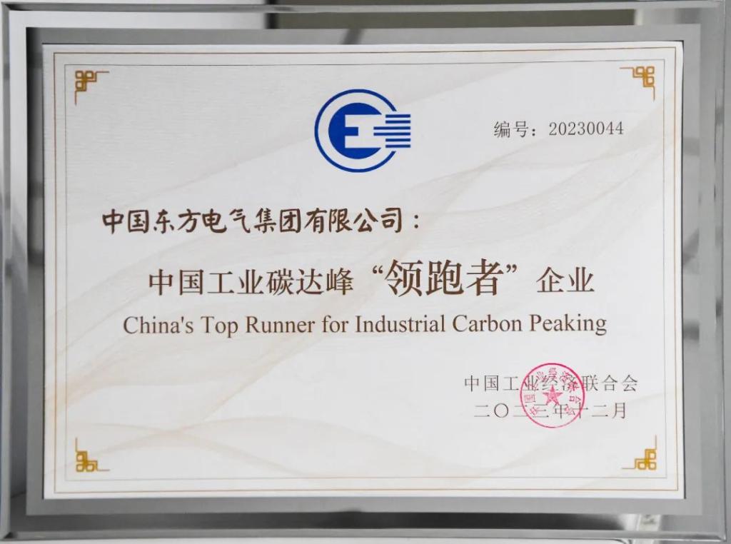2022 年起,在国家碳达峰碳中和工作领导小组办公室指导下,中国工业经济联合会联合工信部、生态环境部、国务院国资委等有关部委和行业智库专家从遴选示范、调查研究和宣传培育三个维度组织开展中国工业碳达峰“领跑者”企业遴选工作。东方电气集团高度重视,精心准备材料和现场答辩,在评审组制定的24项定量指标和4大类定性评价维度中,以名列前茅的成绩入选2023中国工业碳达峰“领跑者”企业。