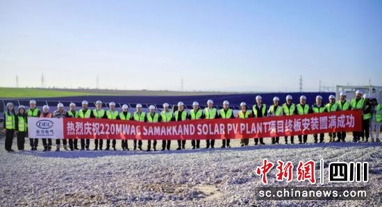 中新网四川新闻4月2日电 近日,由东方电气集团所属企业东方国际总承包的乌兹别克斯坦撒马尔罕光伏项目举行最终光伏板安装仪式。四川省副省长左永祥,东方电气集团党组成员、副总经理李忠军出席终板安装仪式。