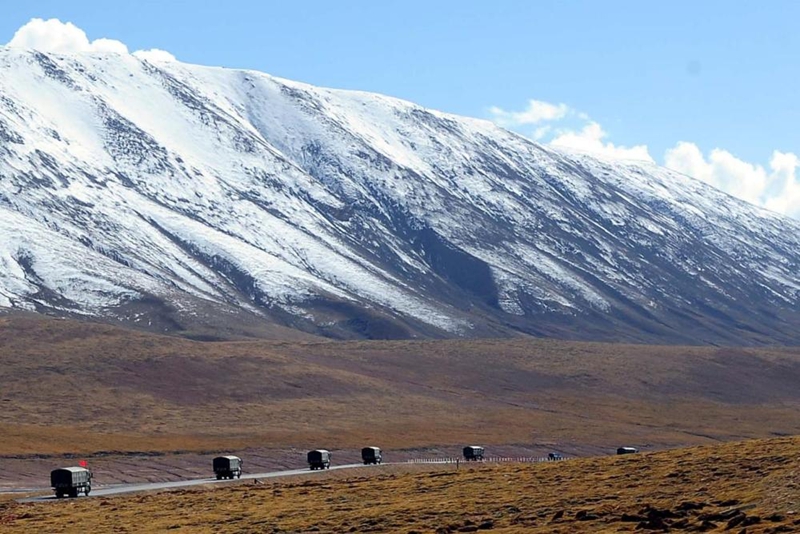 2014年9月27日,一个车队行驶在通往唐古拉山口的途中。青藏公路像一条洁白的哈达,横亘在平均海拔4000米以上的青藏高原。新华社记者 王颂 摄