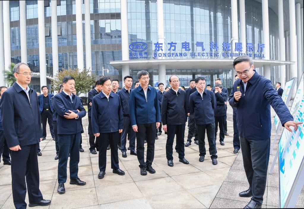 在东方电气科技展示厅,领导们深入了解东方电气集团在科技创新、“六电六业”产业发展等方面取得的最新成果,并对企业始终坚持自主创新表示赞扬。陈刚、吴晓军不时询问企业经营、产品产业,尤其是氢能储能等新产业发展情况,对东方电气集团在发展壮大中孕育出的“东汽精神”以及在能源装备制造领域展现出的硬核实力给予高度评价,关切东方电气集团在青发展情况,鼓励企业聚焦推进“环柴达木区域氢能应用示范基地”、建设“国内最高海拔风电主机与叶片装备制造产业基地”,发挥多种储能技术和光热系统集成技术优势,积极参与和打造大型储能示范应用基地和光热示范基地。王晓晖、黄强表示,东方电气集团是我国能源装备领域的龙头企业之一,要完整准确全面贯彻新发展理念,更好发挥中央企业科技创新、产业引领、安全支撑作用,积极参与川青建设,共同写好打造国家清洁能源产业高地这篇大文章,助推新时代川青合作取得更加丰硕成果,助力两域经济社会高质量发展。